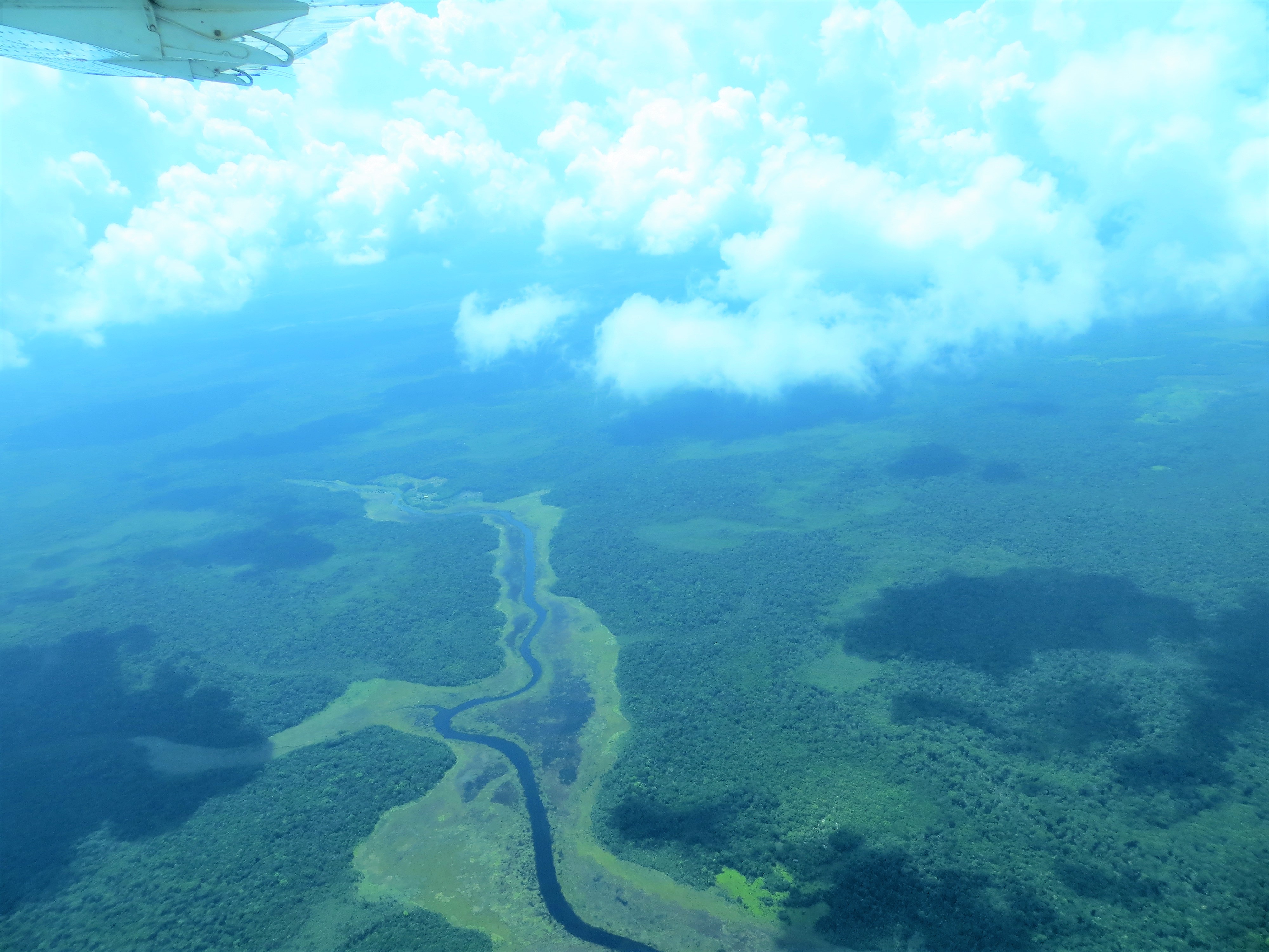 On a hot sunny day with azure skies beckoning overhead I boarded a 12 seater single engine Piper Caravan aircraft at Ogles airstrip. The tiny cabin and absurdly low roof grudgingly allowed me passage to my seat only after careful manoeuvring and bending almost double. The cabin was soon packed with travellers and I wondered, absurdly, whether the tiny aircraft had the means to lift us all off the ground! Despite my misgivings, the Piper, after a startlingly short take off run, soared effortlessly into the sky. As we climbed and then levelled off, I was captivated by the slowly unfolding forest greenery criss-crossed by shining brown waterways which casually writhed to and fro thousands of feet below us.