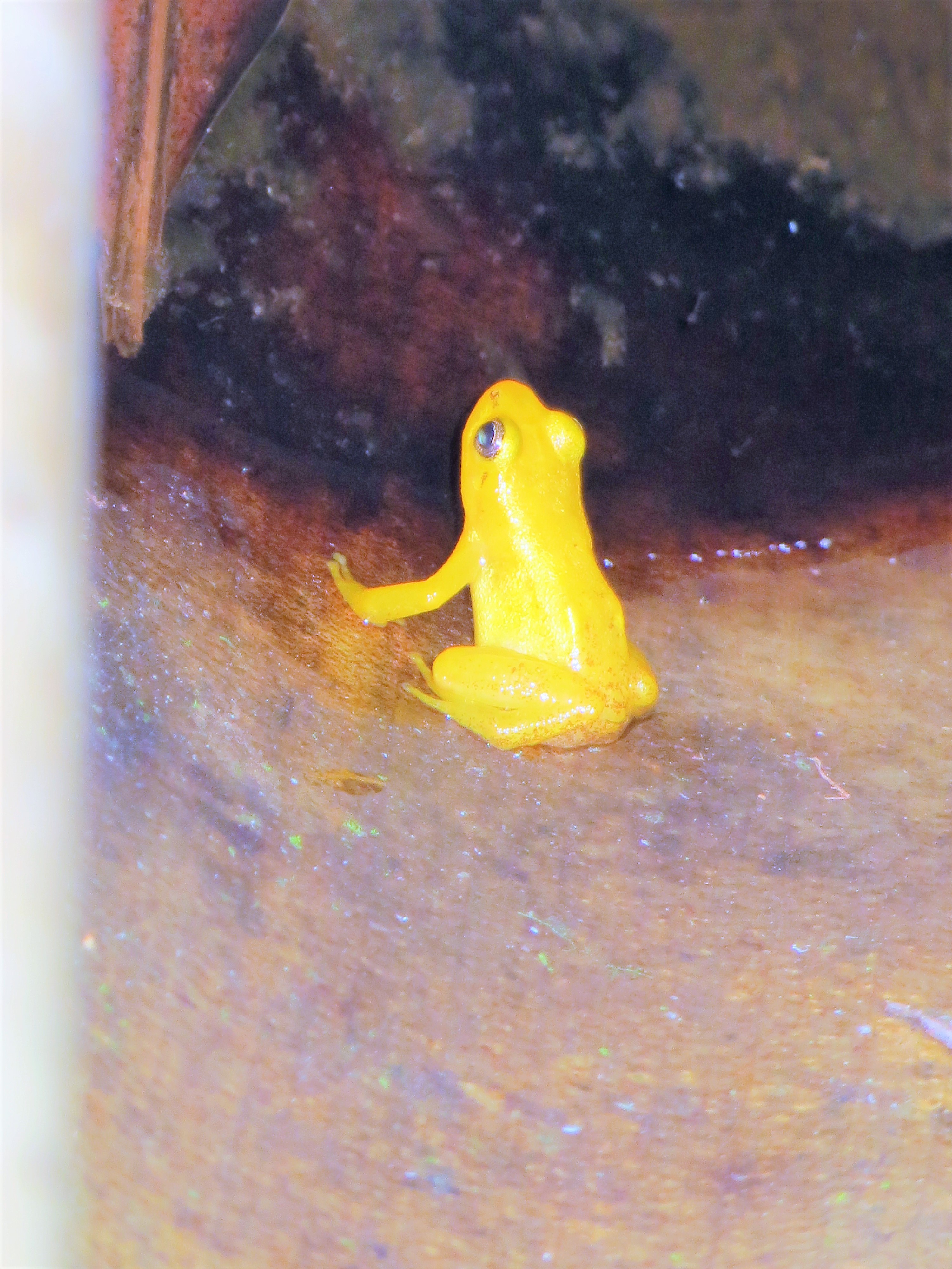 A short but hot and humid trek with our Amerindian guide led us along a rocky path, which allowed us to traverse some reddish rock formations, estimated, much to my amazement, to be over a billion years old. We also stopped and peered into a large pitcher shaped plant where a beautiful miniscule golden frog, not much larger than a finger nail, crouched imperturbably.