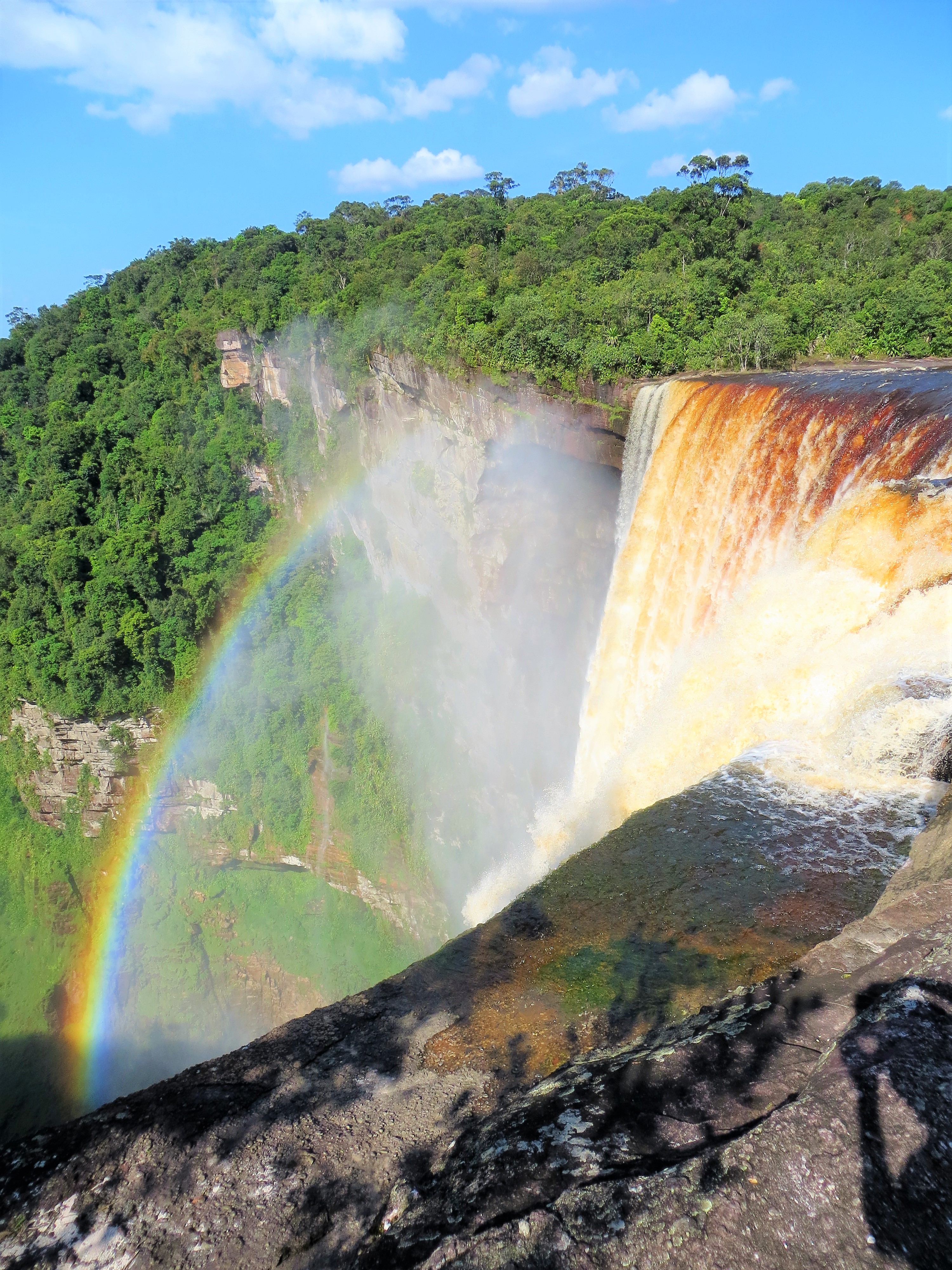 The final look-out point was for me the most special one. My view from one rocky bank allowed me to appreciate the expansive spread of the river as it flowed between banks which were copiously adorned with trees and undergrowth. At the edge of the river-bank I was able to dip a hand into the chilly Potaro. I felt its currents and eddies as it flowed relentlessly over smooth rocks and silt like soil towards the edge of the falls, less than one hundred metres away from me. From this vantage point I was also able to notice a splendorous rainbow which wreathed the voluminous mist and spray at the base of the cataract.