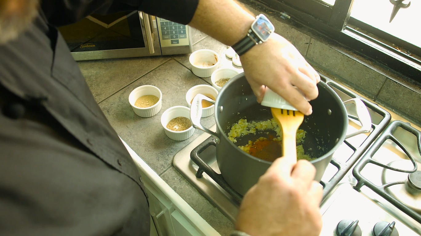 - Add all the ground spices, salt and pepper and stir quickly so they don’t burn. Add ½ cup of water with the tomato paste.